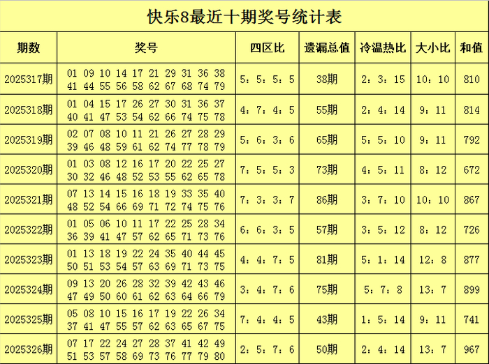 福彩悠然8第2025326期开奖归来:07 17 22 24 27 28 37 41 42 49 51 53 57 58 69 73 76 77 79 80,其中奖号四区比为2:5:7:6,遗漏总值为50,大小比为13:7,012路比为6:9:5,和值为967。