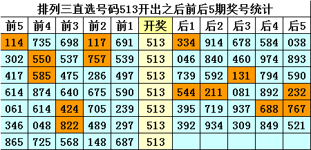 四、成列三直选号码513历史上开出7次,其前后五期奖号离别为: