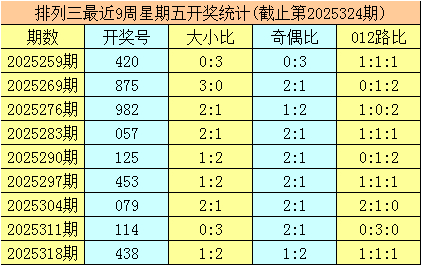 三、体彩成列三前9周星期五奖号离别开出:420-875-982-057-125-453-079-114-438,其中号码012路比为7:10:10,奇偶比为14:13,大小比为12:15;