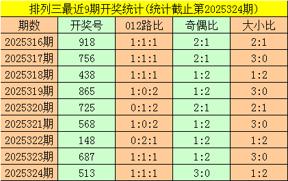 二、体彩成列三前9期奖号开出:918-756-438-865-725-568-148-687-513,其中奖号大小比为19:8,012路比为7:8:12,奇偶比为14:13;