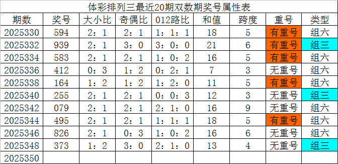 体彩枚举三最近20期双数期奖号别离为:594、939、583、412、164、255、079、495、826、373,各期奖号详备属性下表: