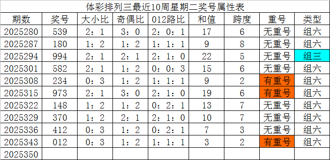 体彩枚举三最近10周星期二奖号别离为:539、180、994、582、234、973、148、370、412、012,各奖号属性详见下表: