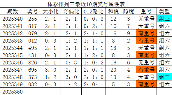 体彩枚举三最近10期别离开出奖号:255、817、079、012、495、431、826、695、373、032,各奖号属性详见下表: