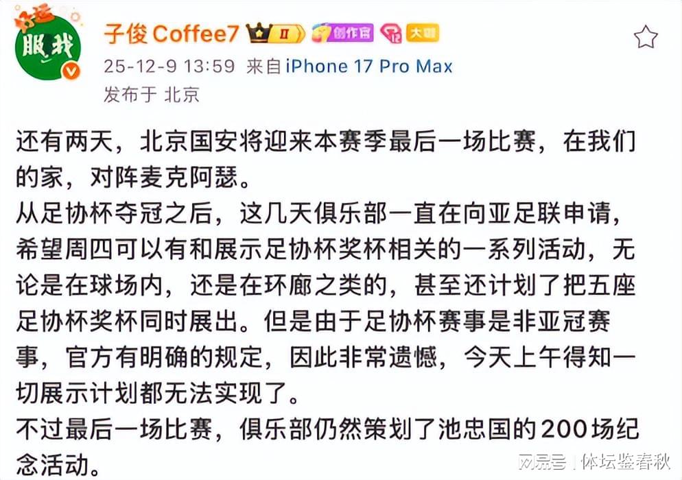俱乐部发文暗示,会照常进行终末一场主场比赛,也会办好宿将池忠国拿到200场里程碑缅念念庆典。但这个“慰藉”关于期待亲眼见到奖杯的北京球迷来说,彰着不够。咫尺北京天冷,12月的夜晚风还带着澈骨寒意,比赛定在晚上20:15,对许多球迷来说周四去看球依然很阻截易,更别提带着期待夜不雅奖杯了。但这种缺憾,也许会成为这个赛季留给球迷最深的回顾。