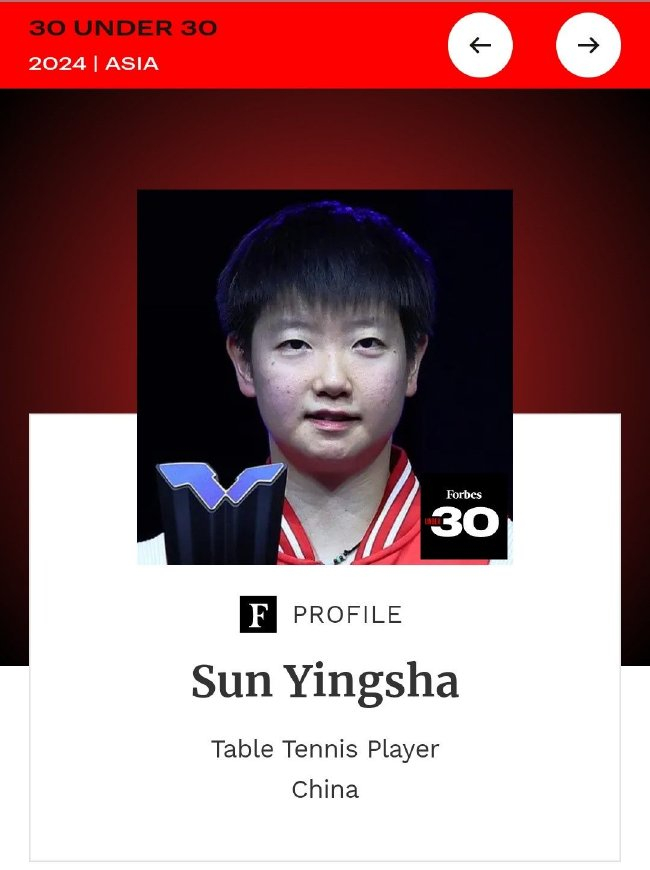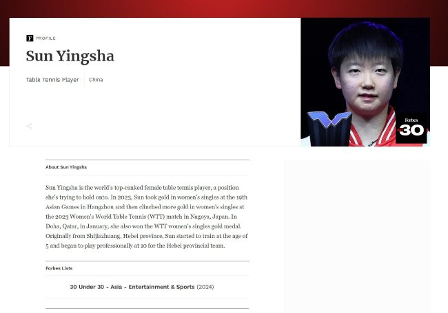 福布斯官网关于孙颖莎给出的入选情理是:孙颖莎是宇宙名纪律一的女子乒乓球浮现员,她正勤苦保捏这个位置。2023年,孙颖莎在杭州举行的第19届亚运会上夺得女单金牌,随后又在日真名古屋举行的2023女子总决赛上,再次夺得女单金牌。1月,在卡塔尔多哈,她还获得了WTT球星挑战赛女单金牌。来自河北省石家庄市的孙颖莎,5岁开动测验,10岁起开动为河北队参赛。