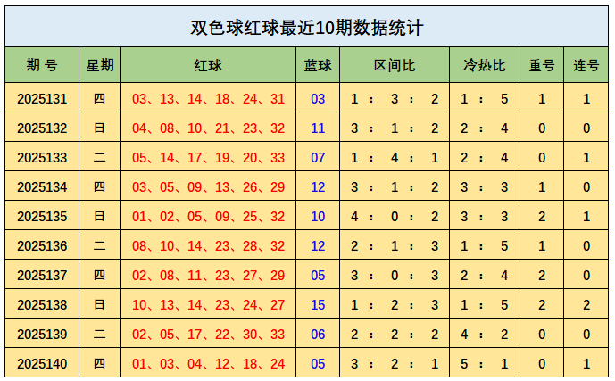 上期回归:双色球第2025140期开出奖号:红球01、03、04、12、18、24;蓝球05,其中红球三区比为3:2:1,开出0枚重号,开出1组连号03、04,蓝球开出二区号码05。