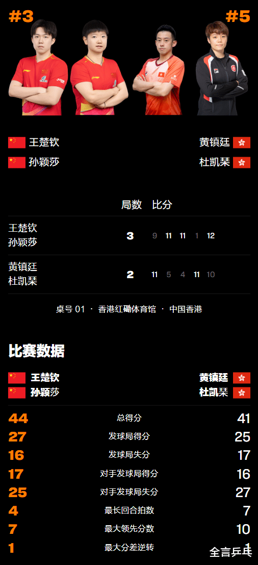 比赛驱动后,黄镇廷/杜凯琹最初发动赢球,但很快便被“莎头”组合追平,紧接着王楚钦/孙颖莎再次过期奋起反击战至7-7逼中国香港队用掉暂停契机。再行参加比赛后,国乒组合8-7反超后8-9、9-10再度过期未能挽救局点,最终以9-11惜败先丢一城。