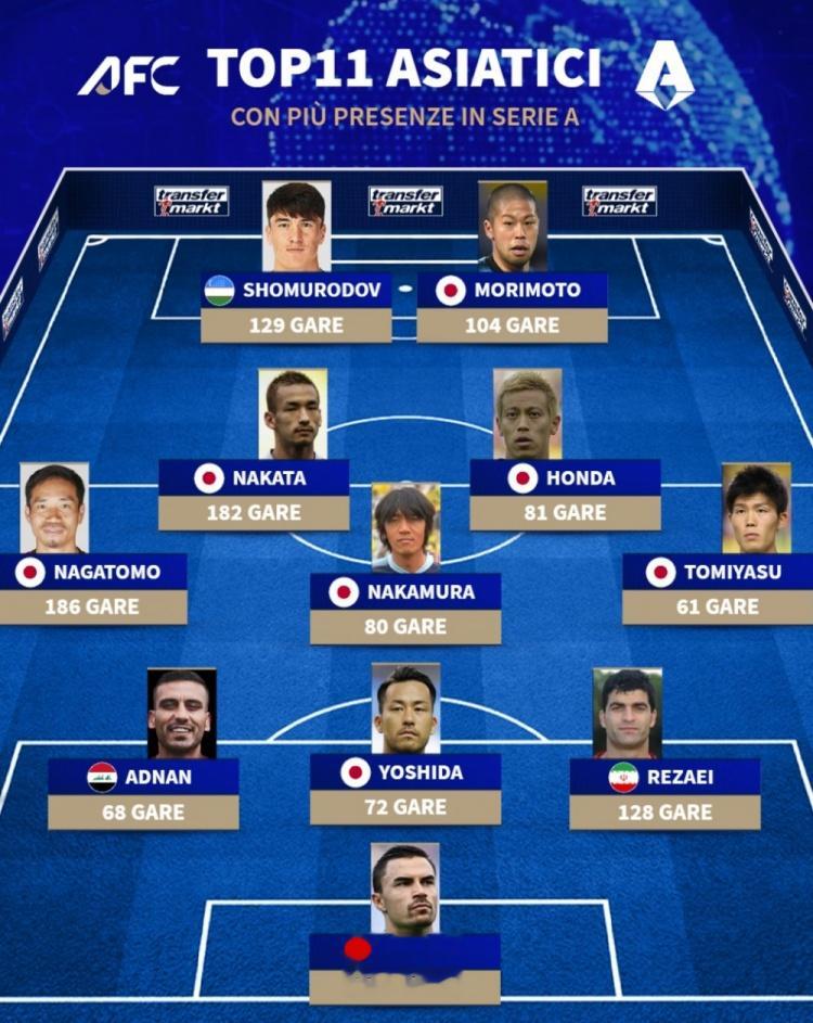 中场:富安健洋(61场,日本)、中村俊辅(80场,日本)、长友佑都(186场,日本)、本田圭佑(81场,日本)、中田英寿(182场,日本)