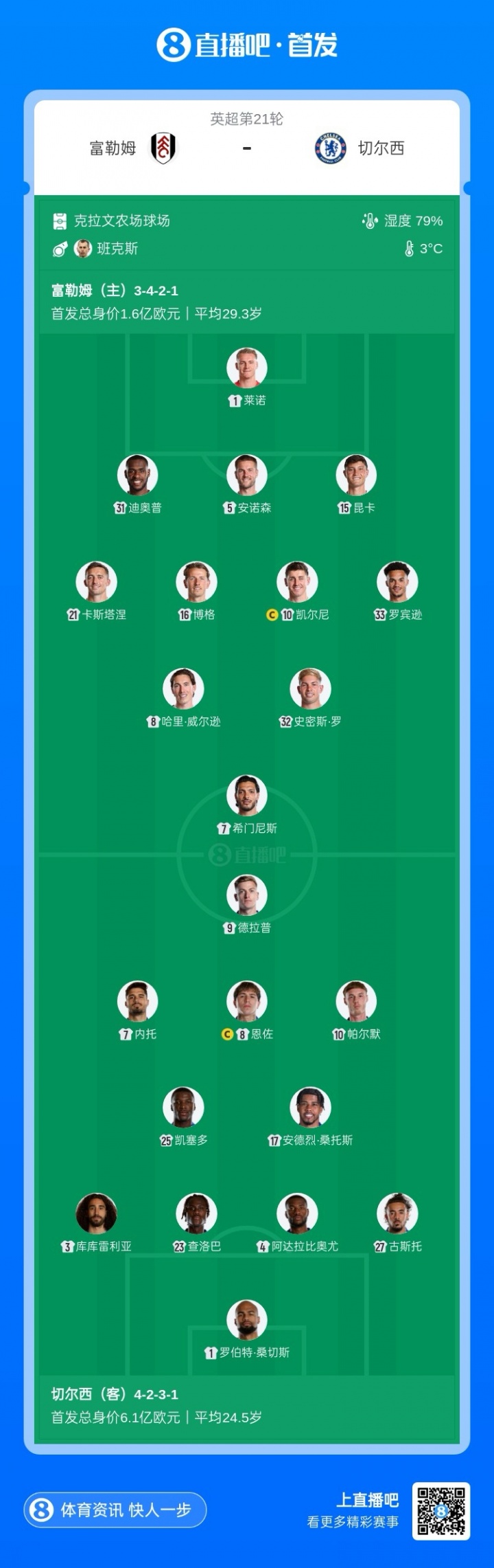 富勒姆首发:1-莱诺、31-迪奥普、5-约阿希姆·安诺森、15-昆卡、21-卡斯塔涅、16-博格、10-凯尔尼、33-罗宾逊、8-哈里-威尔逊、32-史小姐·罗、7-希门尼斯