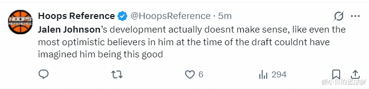 好意思媒Hoops Reference写谈:杰伦-约翰逊的成长资格令东谈主咋舌,实时是他选秀时看好他的那些东谈主齐不敢念念象他能如斯的出色。