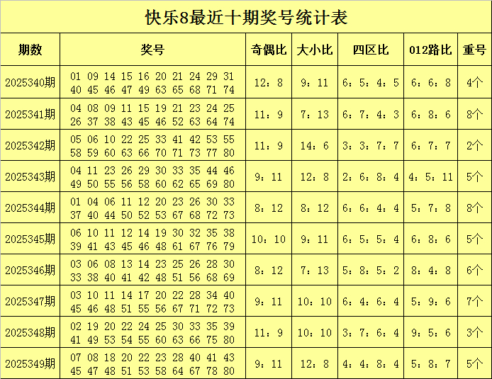 福彩悦目8第2025349期开奖归来:07 08 18 20 22 23 28 40 41 43 45 47 48 51 53 58 64 67 78 80,其中奖号奇偶比为9:11,大小比为12:8,四区比为4:4:8:4,012路比为5:8:7,重号5个:20、22、41、53、80。