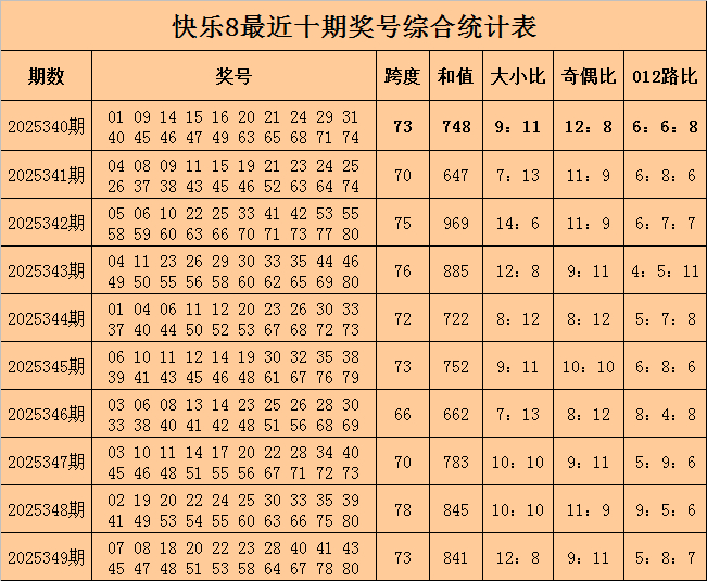 福彩得志8第2025349期开出奖号:07 08 18 20 22 23 28 40 41 43 45 47 48 51 53 58 64 67 78 80,其中奖号跨度开出73,和值开出841,大小比开出12:8,奇偶比开出9:11,012路比开出5:8:7。