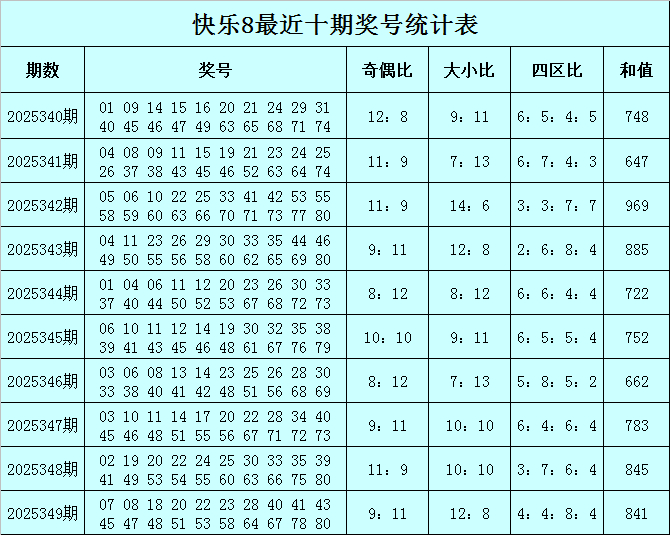 福彩风光8第2025349期开奖回来:07 08 18 20 22 23 28 40 41 43 45 47 48 51 53 58 64 67 78 80,其中奖号四区比为4:4:8:4,奇偶比比为9:11,大小比为12:8,和值为841。