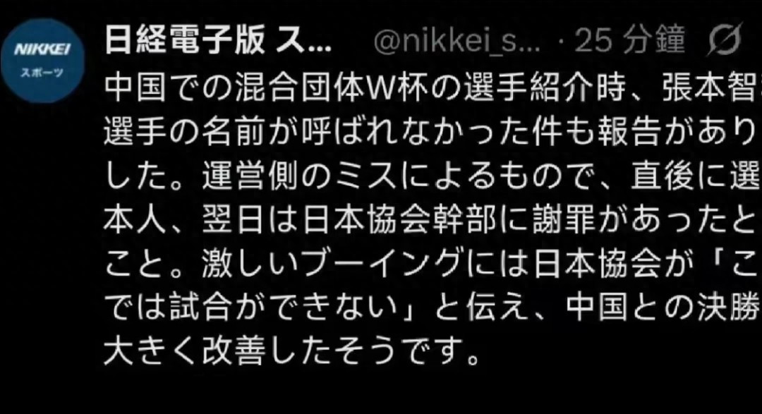 事件源自12月5日,成皆羼杂团体天下杯日本队对阵韩国队比赛前的入场措施,当主握东谈主第二次将张本智和的名字错念成“张本好意思和”时,这位日本头号男单选手已经不肯踏上赛场,面对这一错误,张本智和飞快黑脸拒却入场,直到第三次正确播报才步入赛场,这仍是过握续约20秒