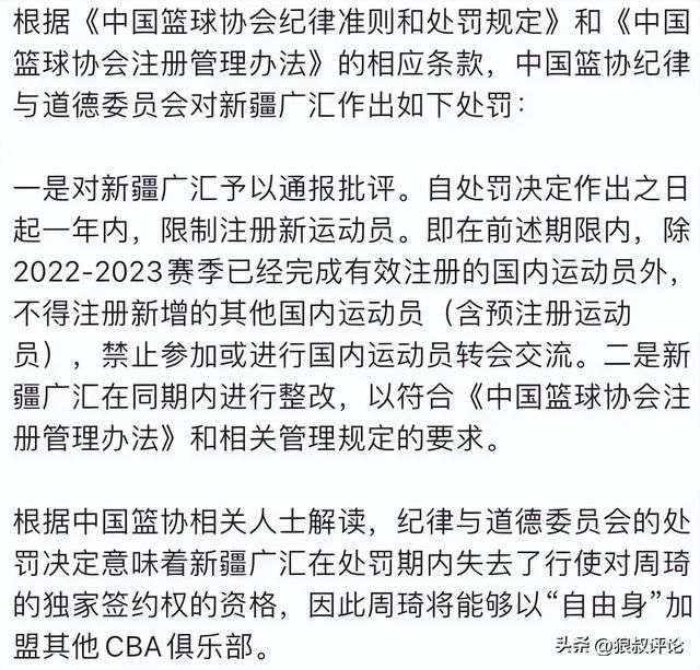 中国篮协发布对新疆广汇篮球俱乐部的处罚见告后,后者将会扼制注册球员,周琦再行取得解放球员的身份,自己能决定去哪儿打球。