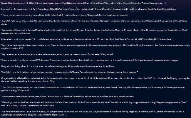 在亚奥理事会清醒员委员会12名成员中的11位插足的在线选举中,中国乒乓球大满贯选手丁宁打败沙特阿拉伯须眉赛艇选手侯赛因-阿利雷扎(Husein Alireza),当选新一任亚奥理事会清醒员委员会主席。而来自日本、如故担任主席13年的小谷实可子(Mikako Kotani)将卸任。
