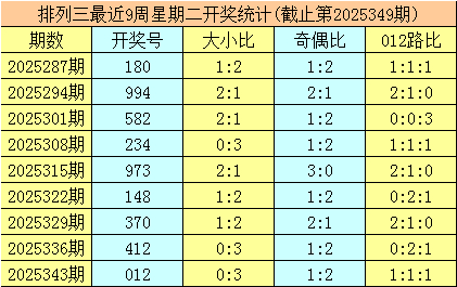 三、体彩成列三前9周星期二奖号鉴识开出:180-994-582-234-973-148-370-412-012,其中号码012路比为9:10:8,奇偶比为13:14,大小比为9:18;