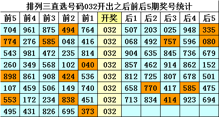四、成列三直选号码032历史上开出8次,其前后五期奖号鉴识为: