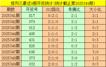 一、成列三第2025349期开出号码032,其奇偶比为1:2,大小比为0:3,号码012路比为2:0:1。该号码直选历史上出现了8次。