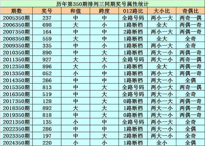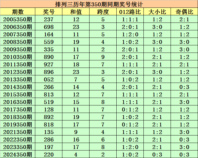 历史上第2025350期陈列三已开出19期奖号了,积年同时奖号辞别为:237、698、164、559、335、890、927、896、052、266、813、519、128、892、818、135、286、197、220,详备统计见下表:
