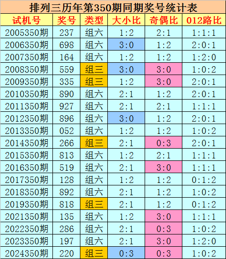 组选类型推选:历史上摆设三第350期同时奖号中,组六出现14期,组三出现5次,本年第350期瞻望奖号为组六号码。